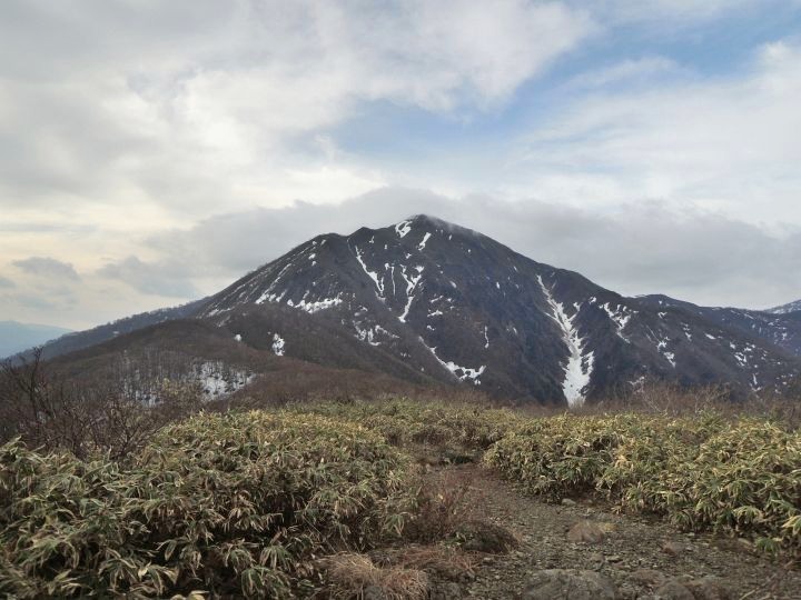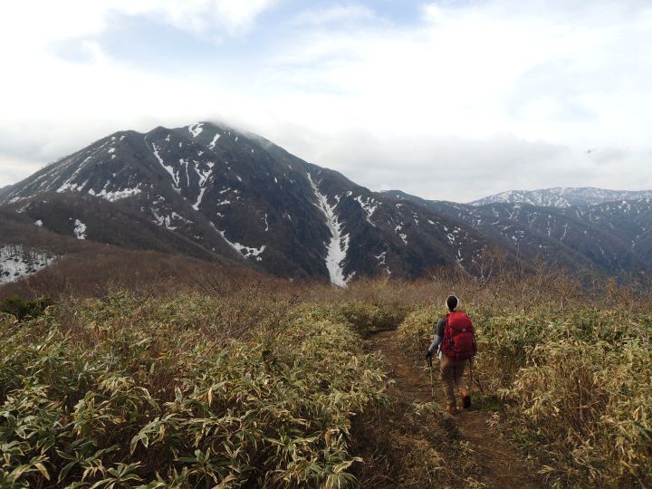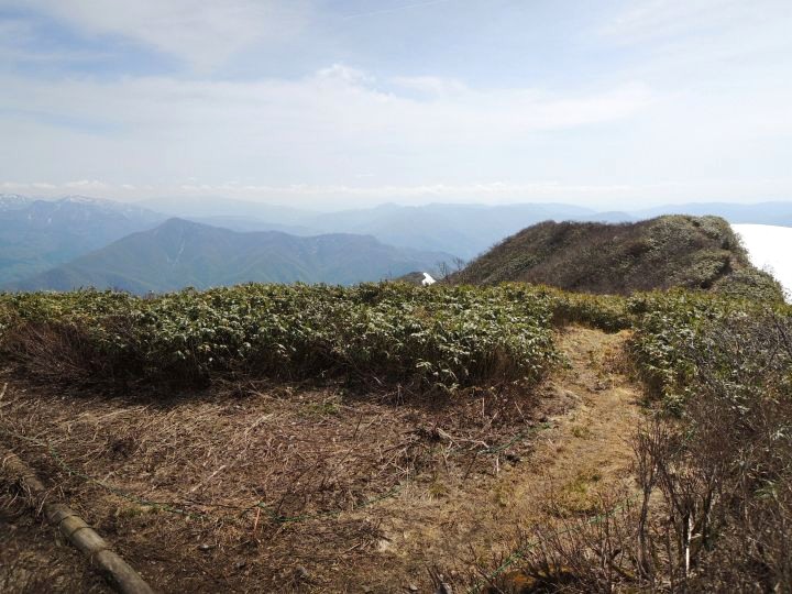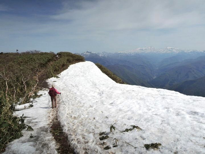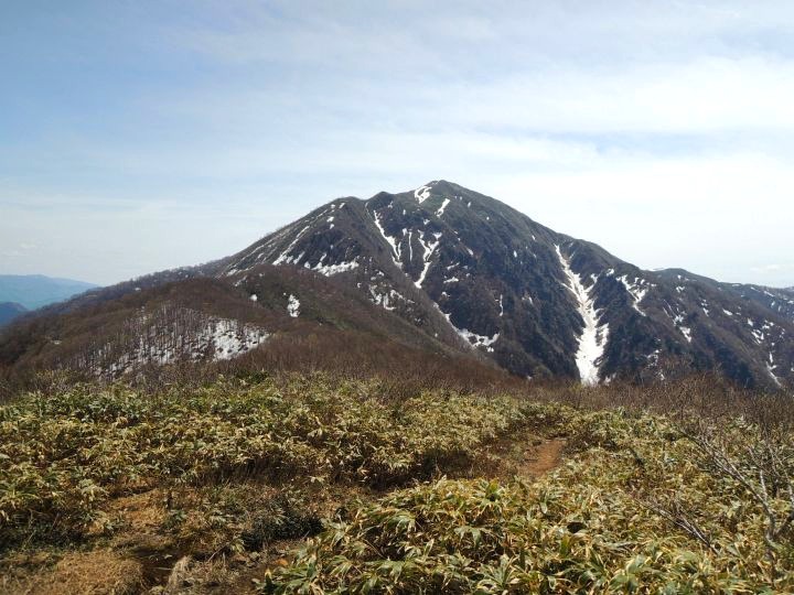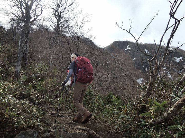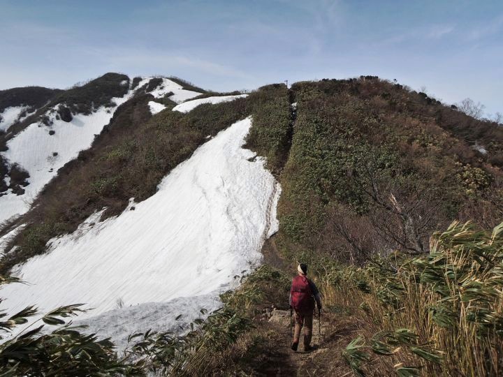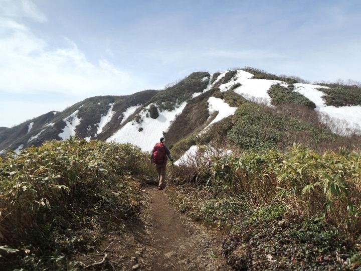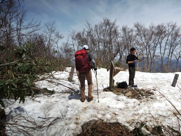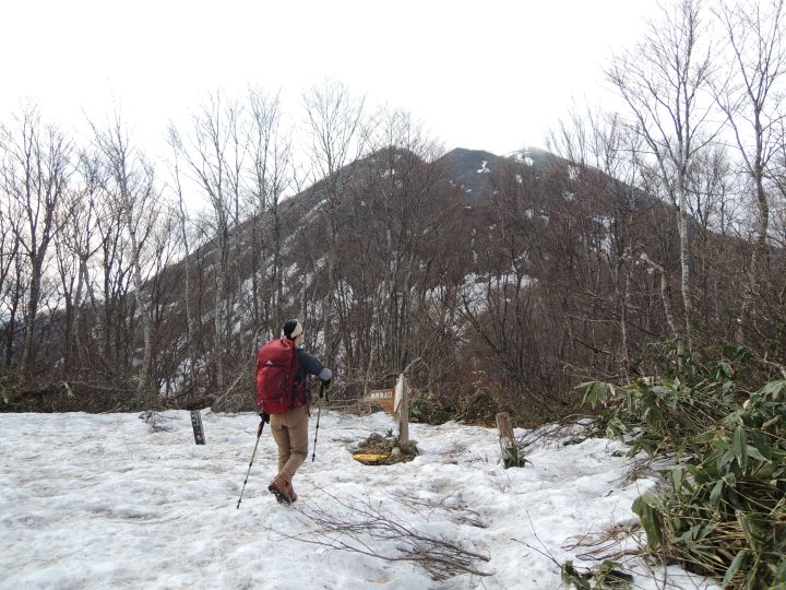 前方に小荒島岳が現れて、登山道には残雪が見られるようになってきた。途中で大きなアオゲラを目にした。