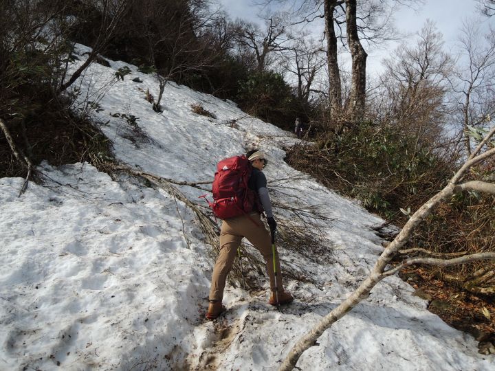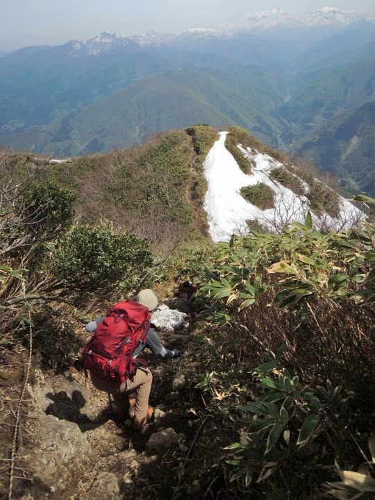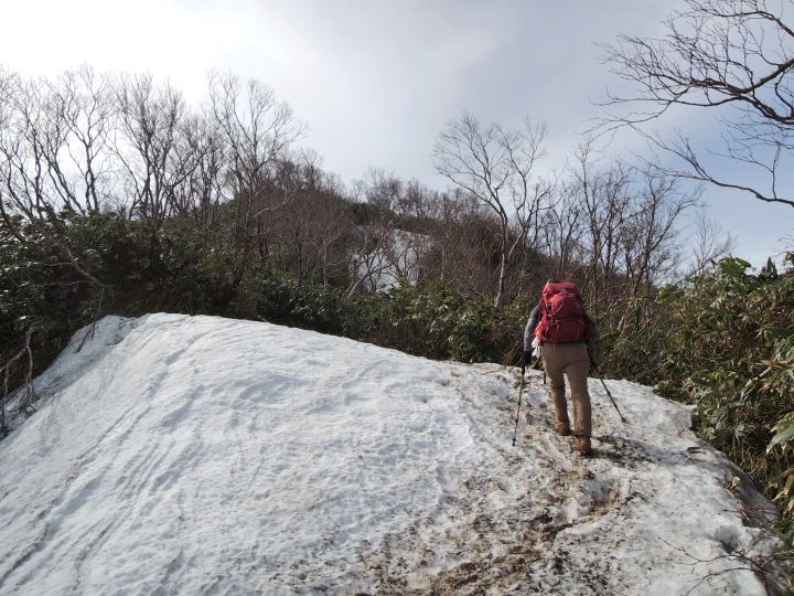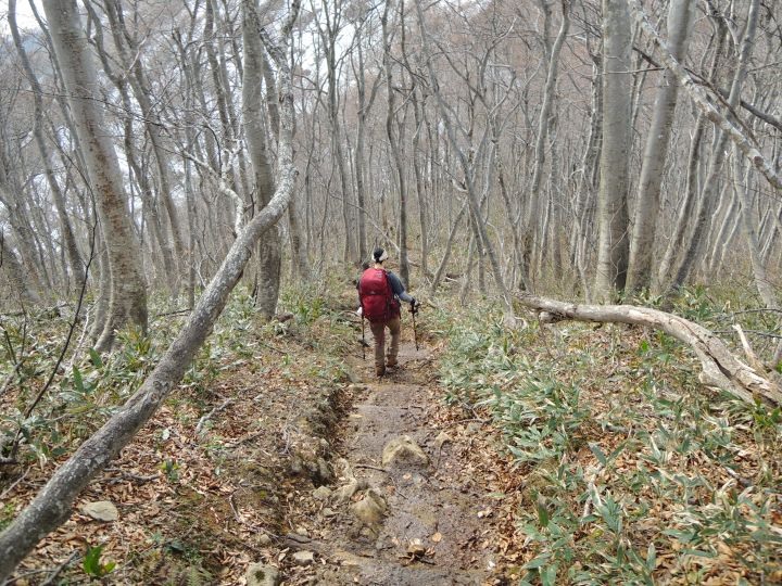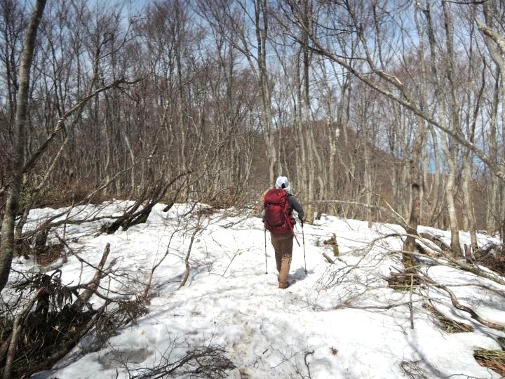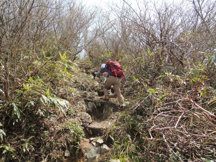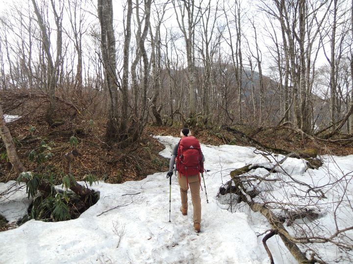 小荒島岳からシャクナゲ平までの樹林帯は残雪と倒木で歩きづらかった。