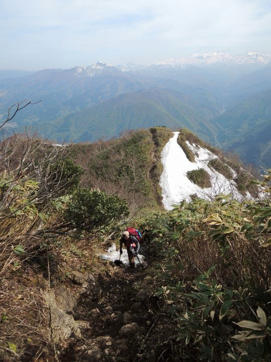 シャクナゲ平から暫くは残雪と倒木で歩きづらくなるが、若干下りである分、往路よりも楽に感じた。
