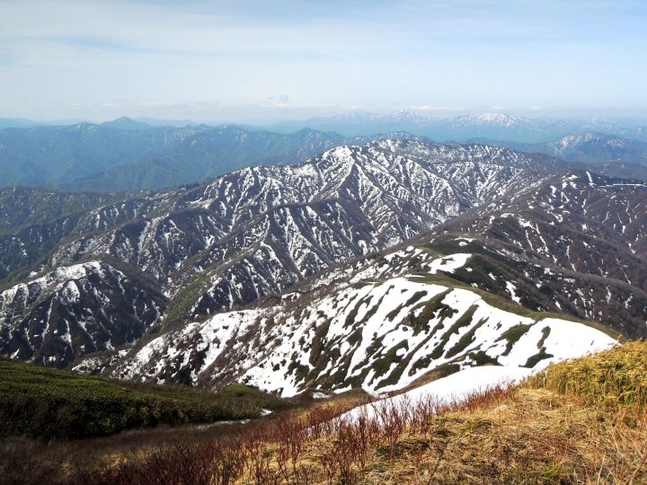 北北東方面。左から経ヶ岳、大長山、真ん中に白山と別山、その右には丸山や芦倉山などが並ぶ。