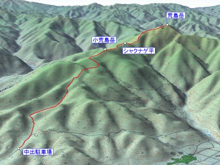 中出駐車場 5:00 → 林道出合 5:35 → 7:30 小荒島岳 7:35 → シャクナゲ平 8:00 → 9:15 荒島岳 9:40 → シャクナゲ平 10:35 → 11:00 小荒島岳 11:10 → 林道出合 12:15 → 中出駐車場 12:40