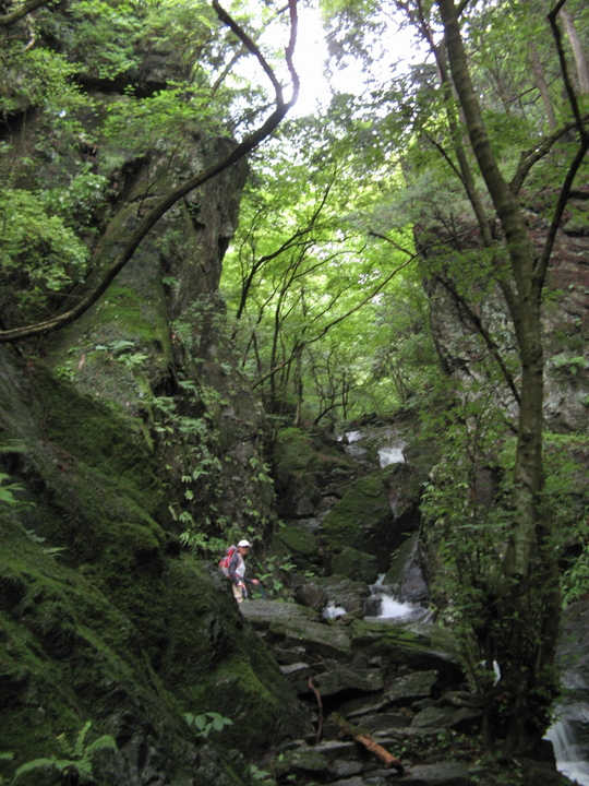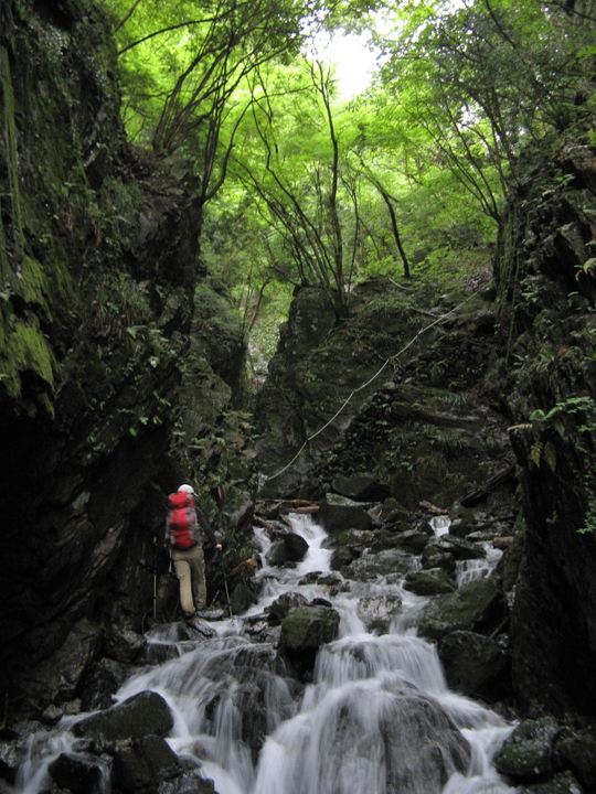 2番目のゴルジュも増水して足場が狭くなっていた。岩壁にホールドを探しながら慎重にクリア。