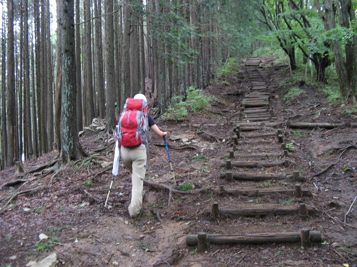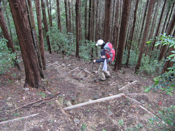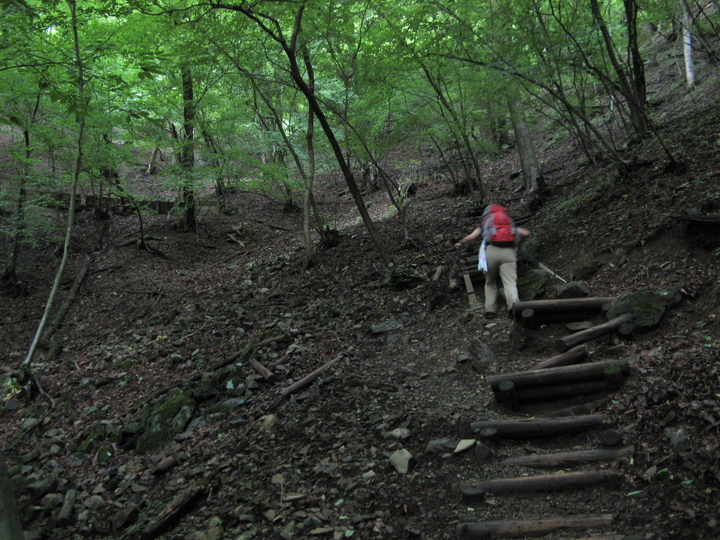丸太階段は間の土が流されて歩きづらいので避けて上る。