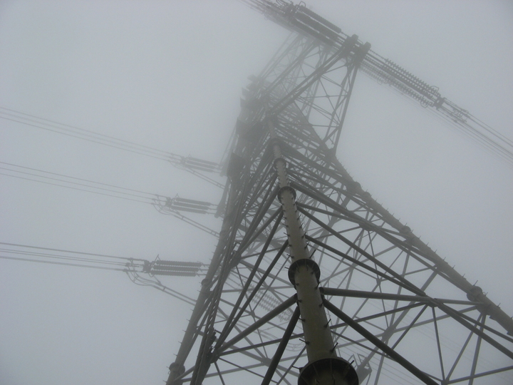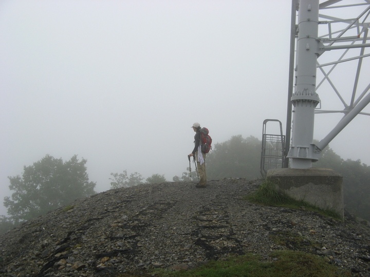 9:40 50号鉄塔に出た。本来は展望のきく場所だろうが、あいにく霧雨の中で周囲は真っ白。