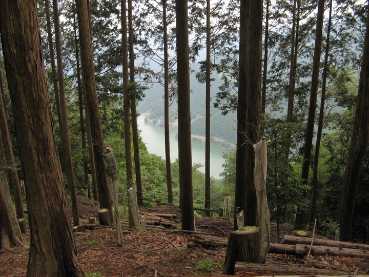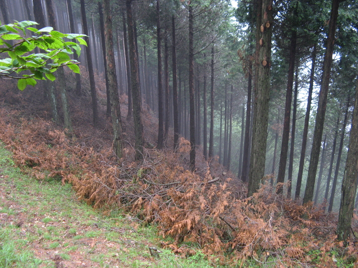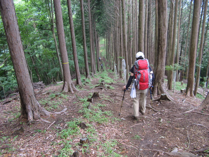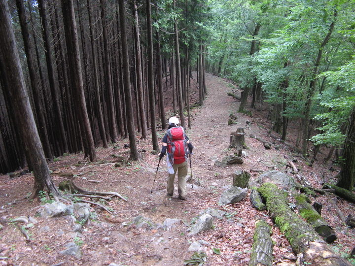 植林と自然林の間をぐんぐん下る。足腰に疲労を感じていたが、まだ余力は充分。