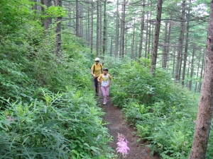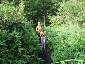 歩きやすい道が続いたものの、笹などの下草が山道を覆うように茂っていた。