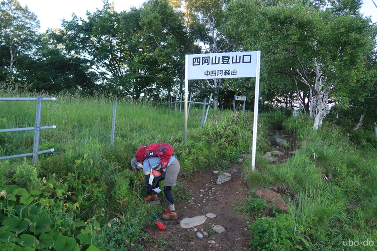 5分ほどで登山口に到着。途中で声をかけてきた地元の方が、「藪漕ぎに近いような笹原があって、濡れているのでびしょびしょになるよ」と言っていたので、妻はスパッツを装着。