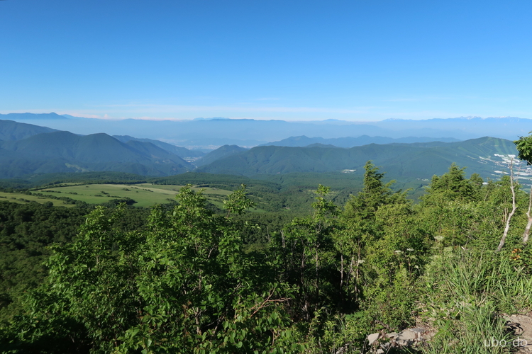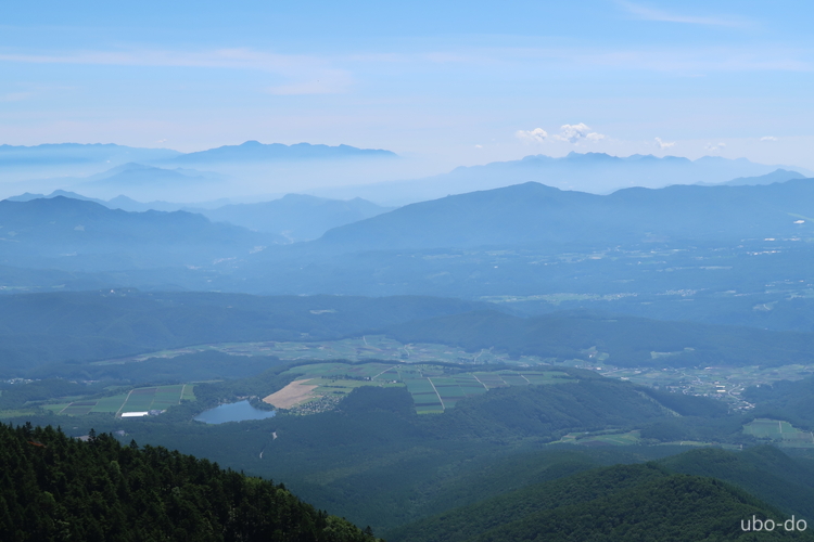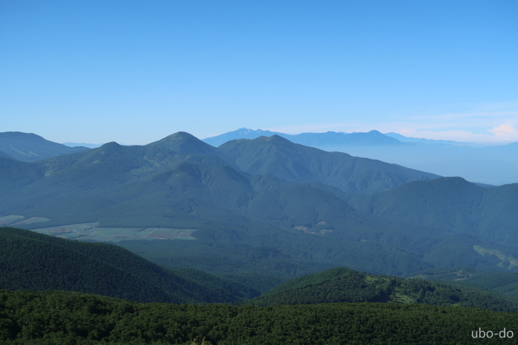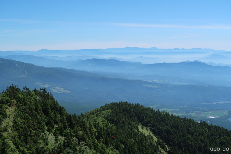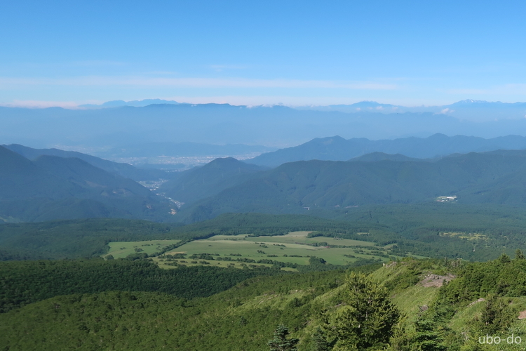 南西方面。真ん中やや左に美ヶ原高原、その左上には中央アルプス、右には御嶽山と乗鞍岳が見える。