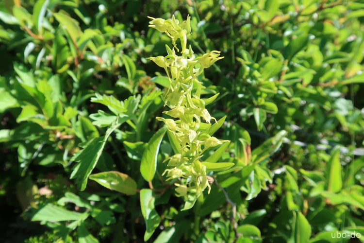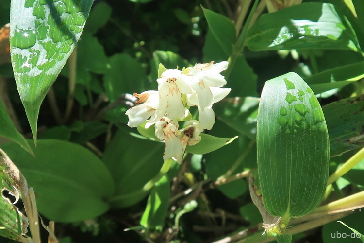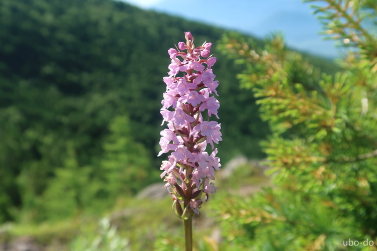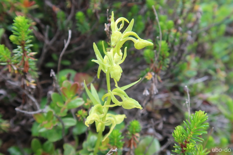 ラン科のハクサンチドリ。しなびた花が多かったが、笹原の陰に形のよいものが残っていた。