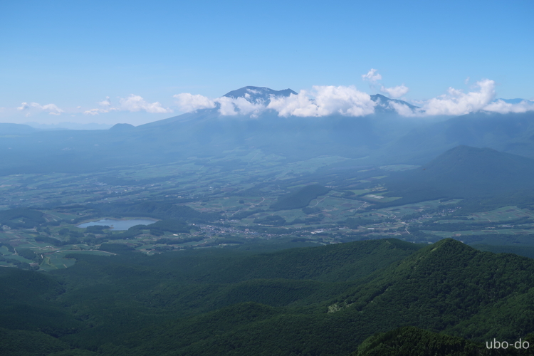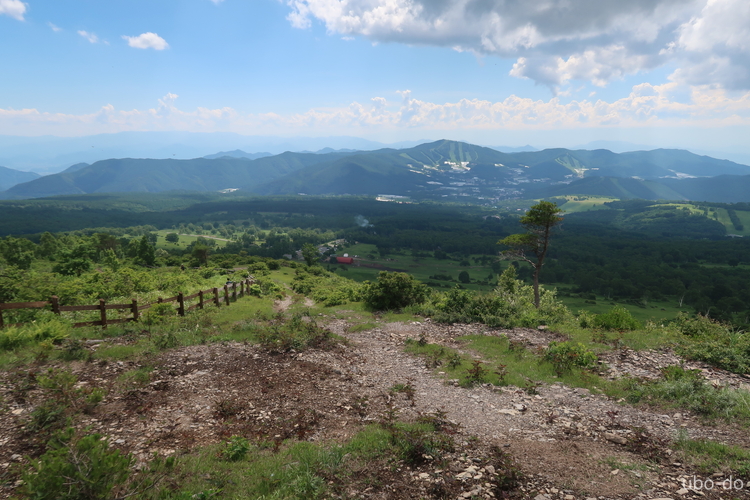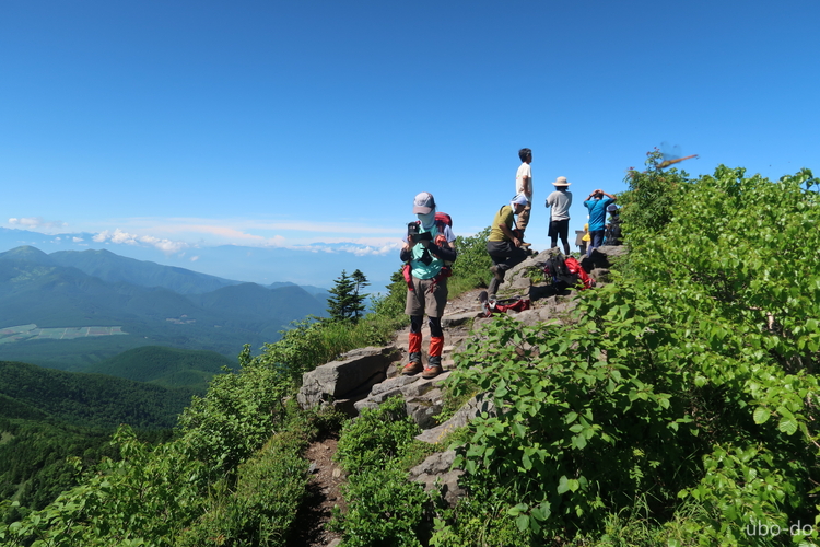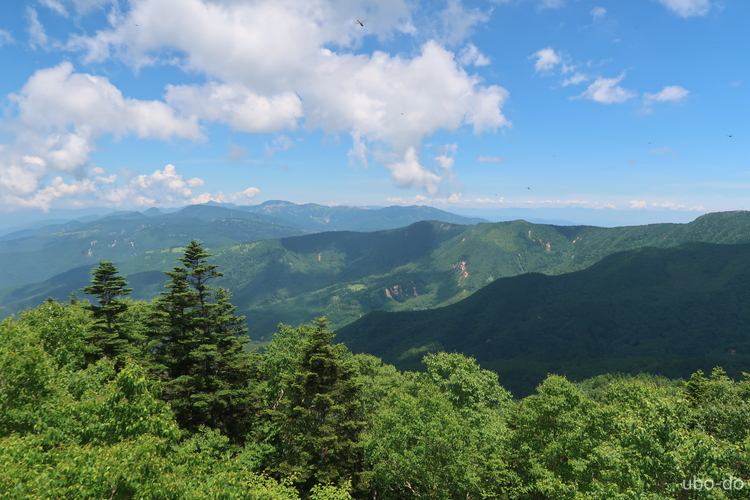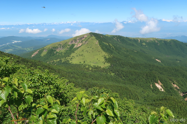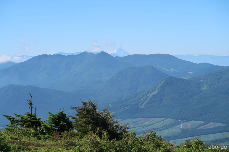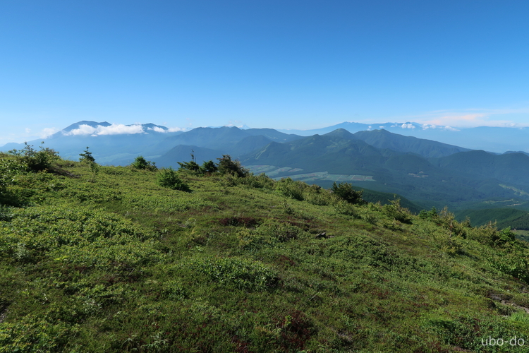 山頂の東端まで行って、北東方面を眺めた。真ん中奥に、岩菅山、横手山、草津白根山が並ぶ。