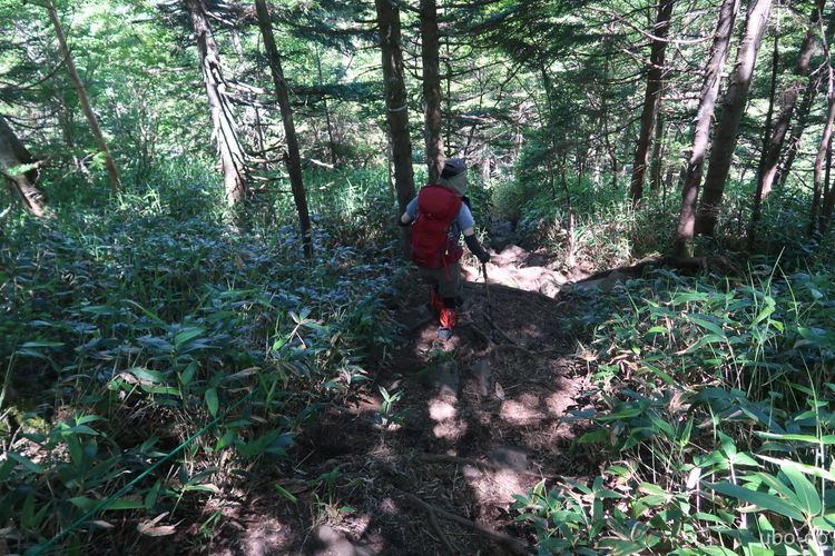 シラビソの樹林帯をどんどん下る。補助ロープを設置した急な箇所もあったが、危険を感じるような下りはなかった。