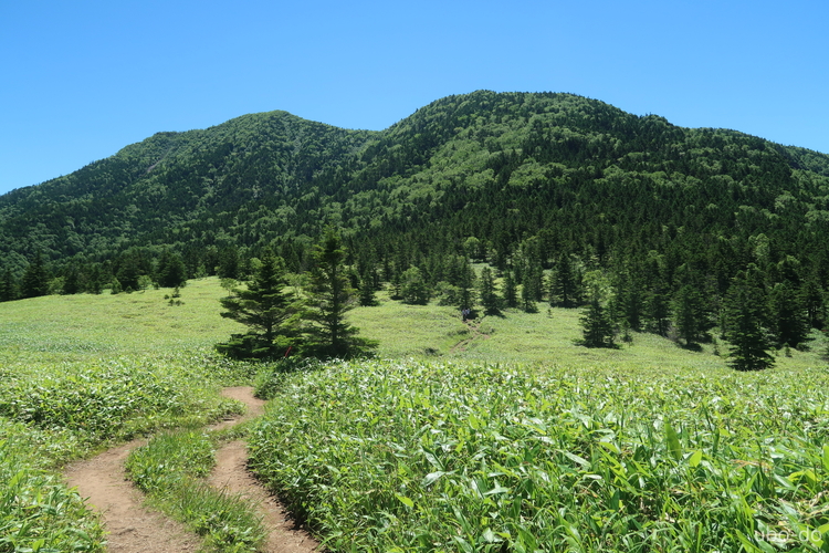 10:45 四阿山と根子岳の鞍部、十ガ原に出た。根子岳の東斜面に広がる笹原が美しい。