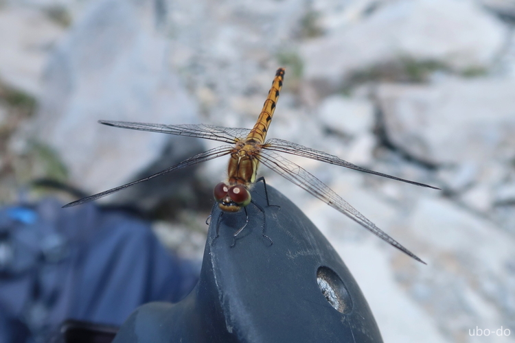 ストックにとまるアキアカネ。根子岳上空には信じられないほど数多くのアキアカネが飛び交っていた。