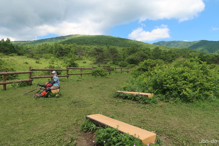 14:00 東屋とベンチがあったので、休憩することにした。後ろに見えるのは根子岳と四阿山。