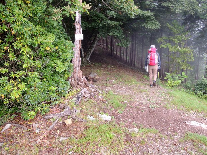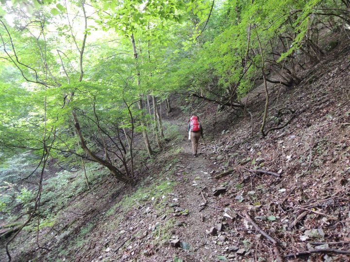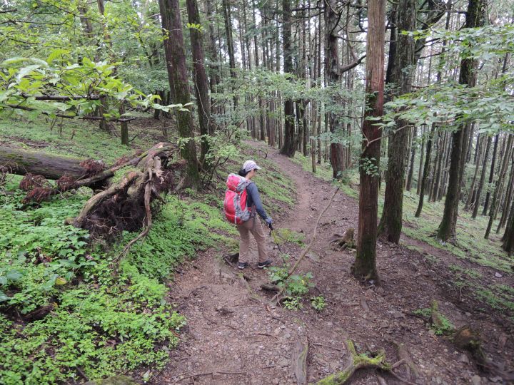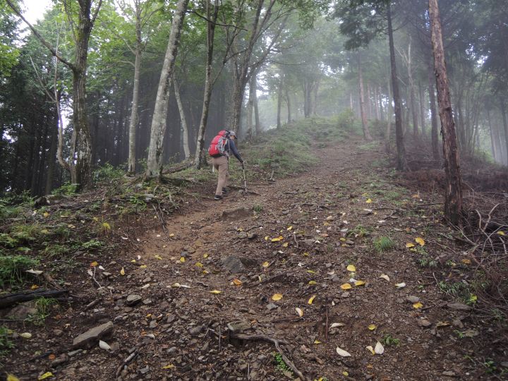 小持山からシラジクボ峠まで一気に下る。斜面が濡れていて、滑りやすかった。