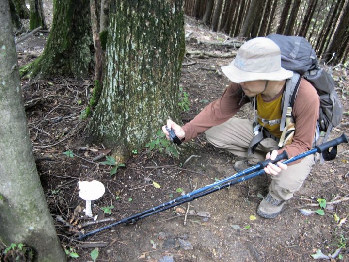 4時起床、4時25分出発。299号を通って生川に6時5分到着。天候不順のため1ヶ月以上も間が空いてしまったので、とにかく歩こうとトレーニング登山に出かけた。蒸し暑くて風もなく、大持山までに汗をたっぷりかいた。雨が多くてじめじめした天気が続いたためか、尾根に出てからは奇妙な茸が目に付いた。あまりに多いので、小持山を過ぎてからは茸を撮りながら進んだ。身体が重くて上りは長く感じたが、久しぶりの山歩きは楽しかった。ガスや雲で遠望もきかなかったが、雨に降られることはなかった。