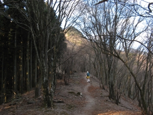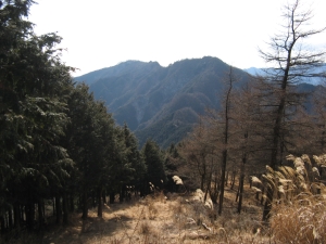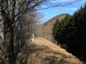 急坂を上り切るとなだらかな道が続く。しばらくすると、木立の間から大持山と小持山の稜線が見えてきた。