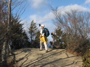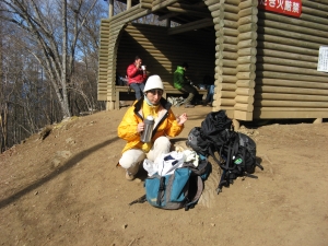 10:15 小持山山頂に到着して、嫁はよく分からんポーズを決める。ここまで3時間で来ることができた。