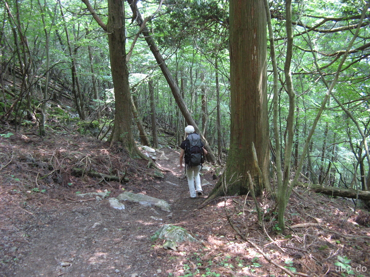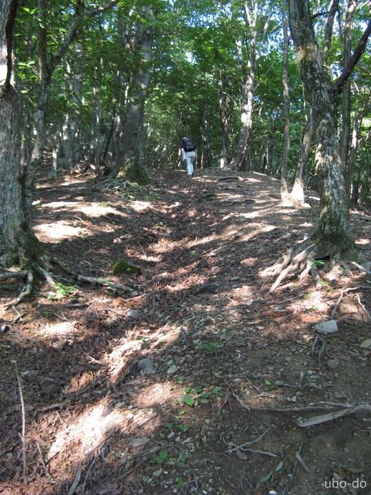 尾根の分岐手前の坂を上る。時折日向に出るが、朝から強烈な日差しだった。