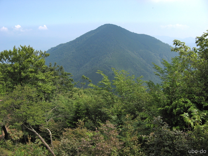 峠から30分で山頂部の十字路に到着。樹間に眺めた大持山と小持山。
