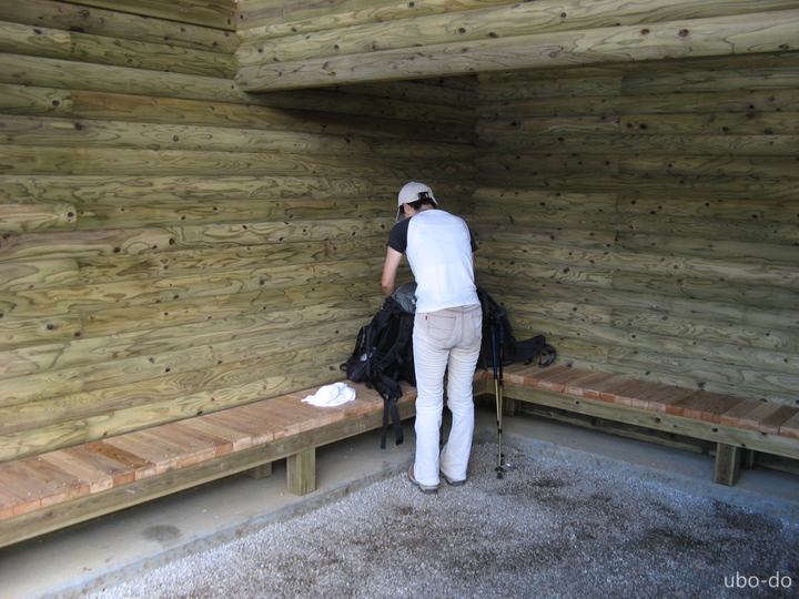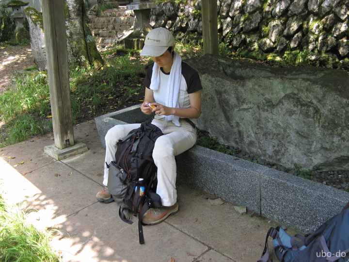東屋はスズメバチがうるさいので神社手前の石碑で食事にした。山でプリムス・バーナーを初めて使用したが、虫がうるさくて写真を撮る余裕がなかった。