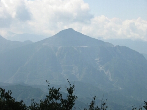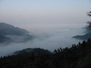 定峰峠をすぎてしばらく行くと西に展望が開ける。朝は霧が出ていた。