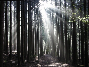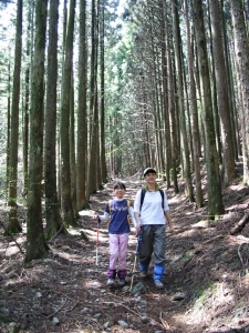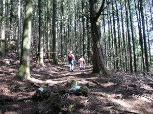 早朝の陽光がもれてくる山道を歩く。最初はコンクリートで整備された沢沿いの林道が続く。