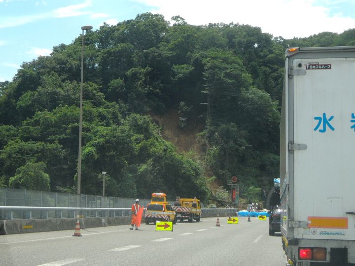 11:50 入間IC付近で高速脇の山林が土砂崩れ。先は長いのに、これが原因で2時間ロスした。