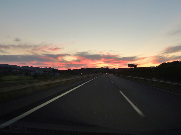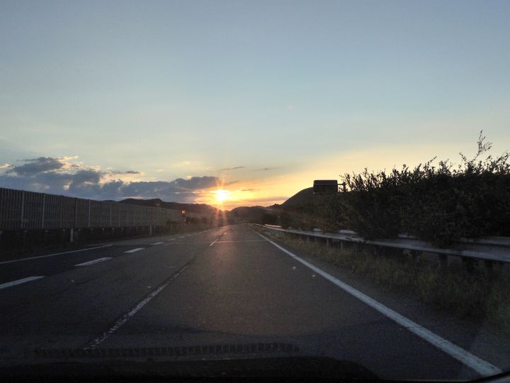 16:20 高速の先に日が沈む。すでにかなりの疲労度だったが、まだまだ運転は続く。