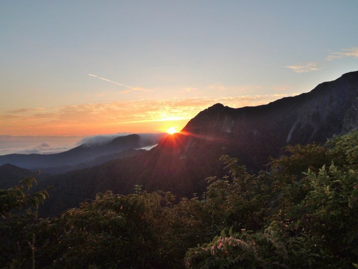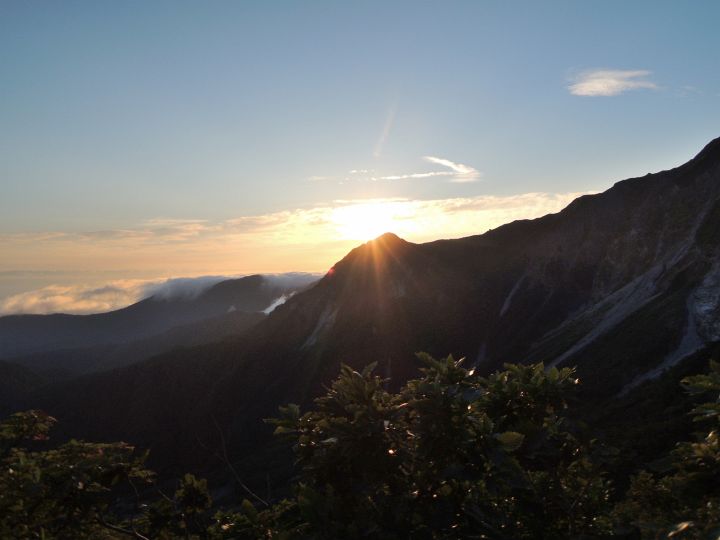 行者谷別れの分岐を通過して、5:40 三鈷峰の隣に朝陽が昇ってきた。
