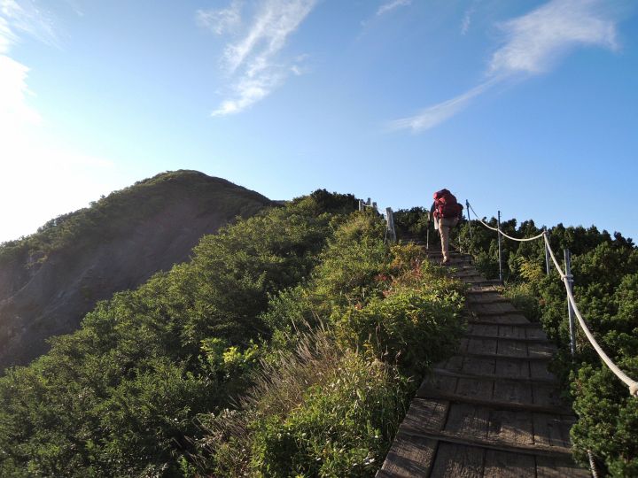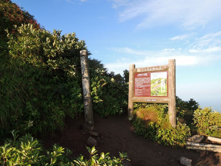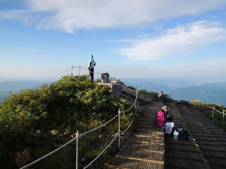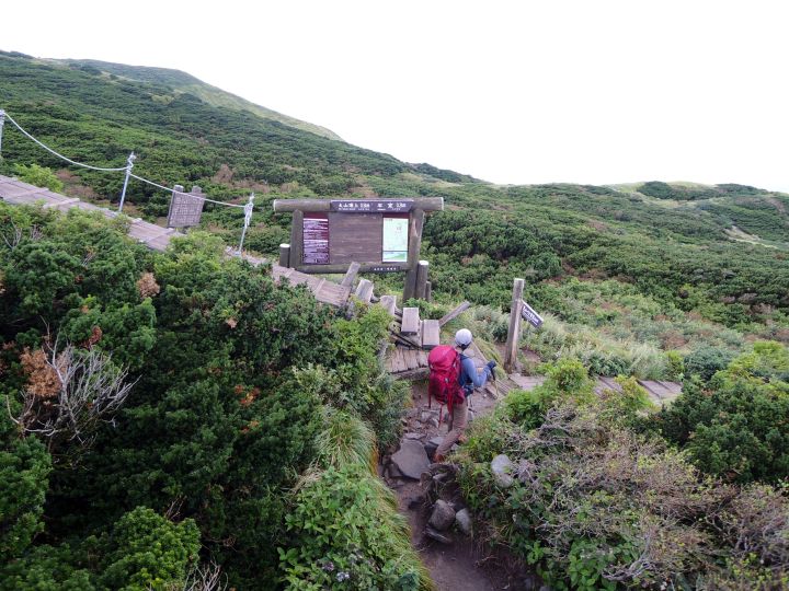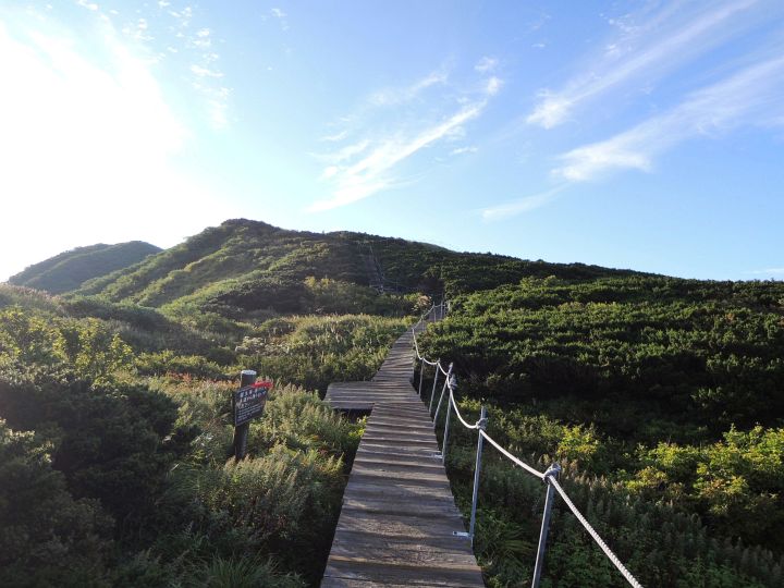ダイセンキャラボクなどの植生保護のために作られた木道は、山頂までゆるやかに延びていた。ハイカーを信用しないかのように延びているロープが、ちょっと目障りに感じた。