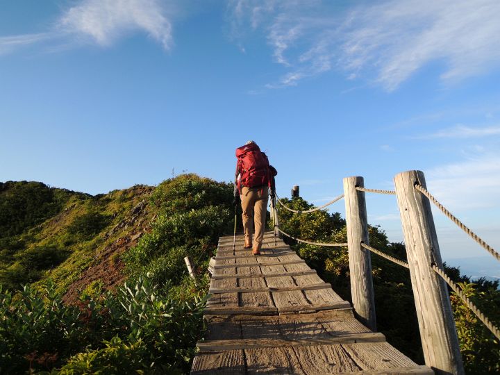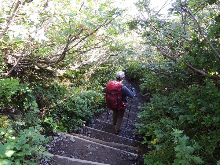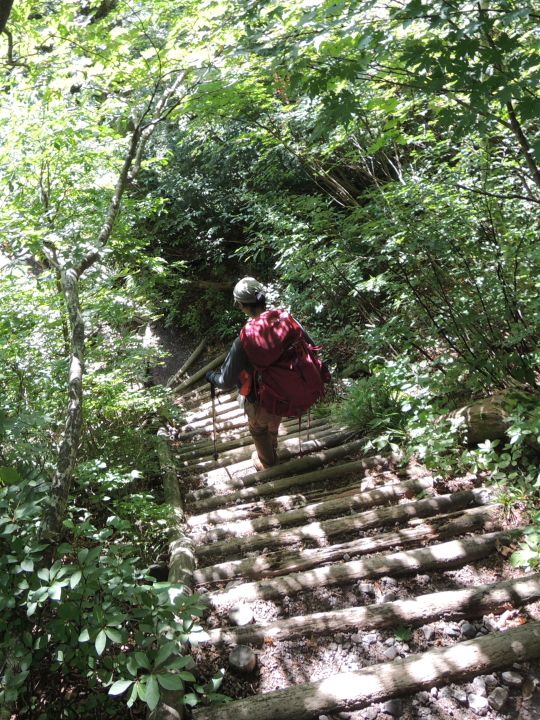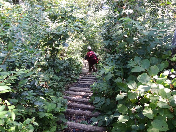 大山の夏山登山道は8割方木道や丸太で整備されているので、子供でも安全に登れる。