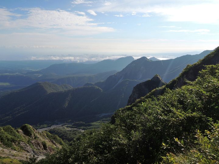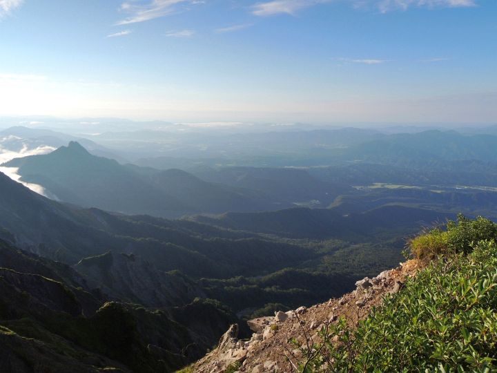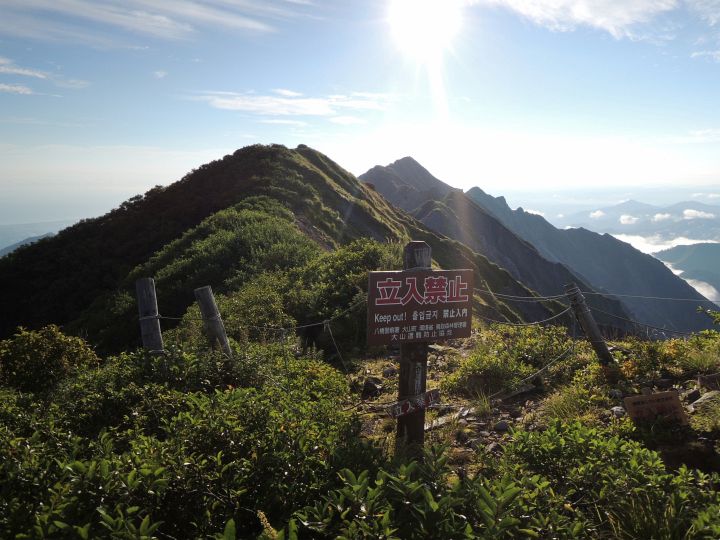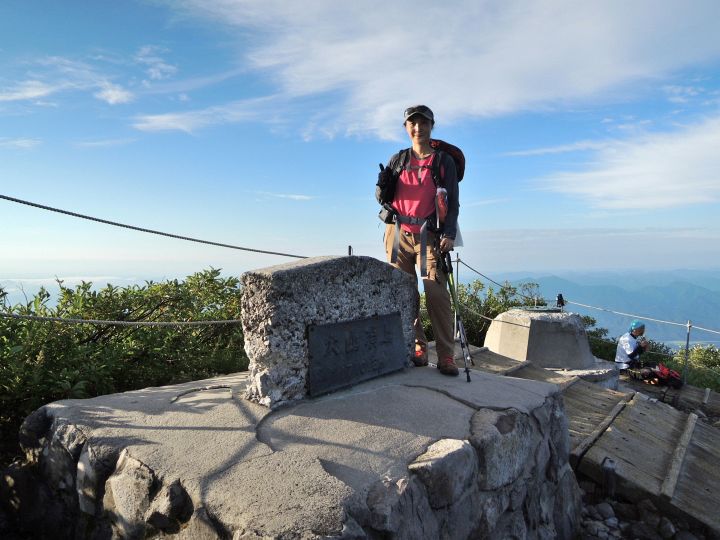 前日は移動日で登山口の南光河原駐車場に車中泊。当日3時起床、4時5分登山開始。当初は三鈷峰に登ってから弥山に登るつもりでいたが、昼からくもりの予報だったので、まず弥山へ向かった。森林限界を超える六合目付近からは展望が開けて、弥山山頂からは360度の大展望を楽しめた。弥山の後は三鈷峰へ登るつもりでいたが、予想以上の気温の高さと疲労を考えて見送った。もし先に三鈷峰へ向かっていたら大変な登山となった上に、昼前には山頂にガスがかかっていたので弥山の展望も見逃すことになっていただろう。出発前に天気を確認して計画変更したことが吉と出た。行者コースでの下山途中、元谷から眺めた大山北壁は大崩落しており、立入禁止となっている最高峰の剣ヶ峰(1,729m)に登れる日が再び来ることはないように思えた。