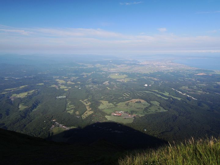 陽が高くなって小さくなった影大山。麓のゴルフ・コースがいくつも見えていた。