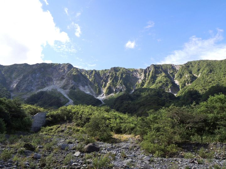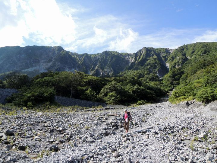 9:05 元谷の広々としたガレ場に出た。背後には大山の北側斜面が屛風のように広がる。
