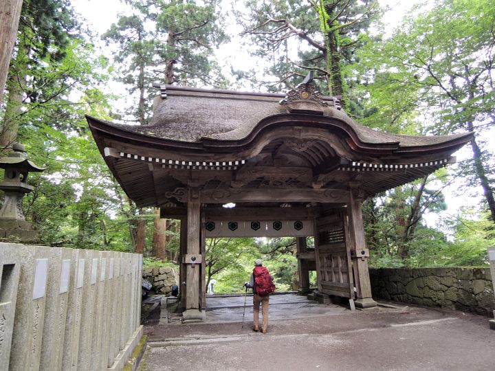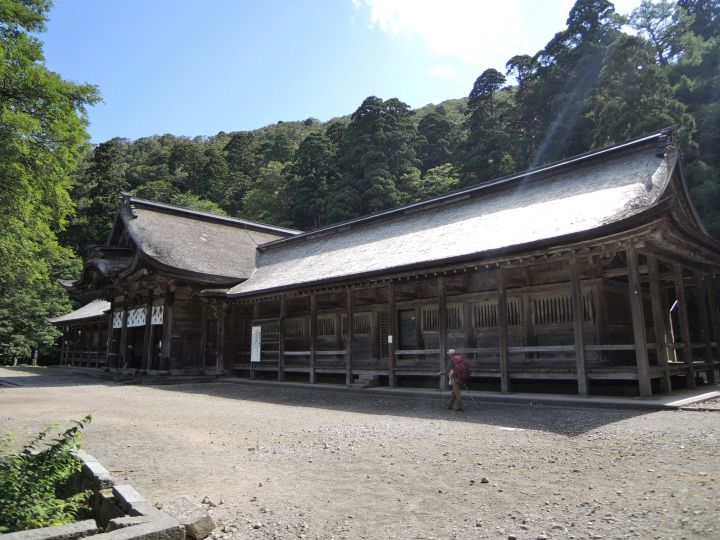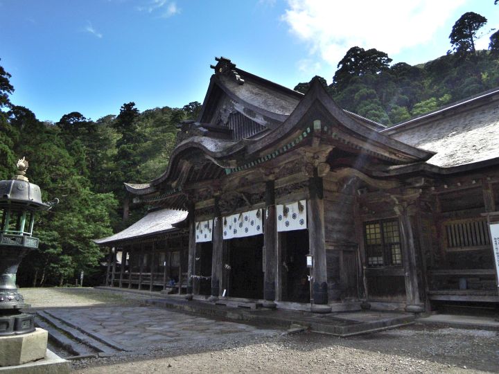 9:35 大神山神社奥宮に到着。御祭神は大己貴神(おおなむちのかみ=大国主神)で、大山そのものが御神体。左右に延びる長い廊下は翼廊(よくろう)と呼ばれて両翼50mにも及び、建物の長さから僧房のような印象を受ける。隠岐を脱出した後醍醐天皇がここで鎌倉幕府打倒の祈願をしたと云われるが、最盛期の栄華が偲ばれる。