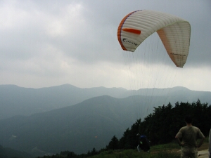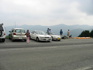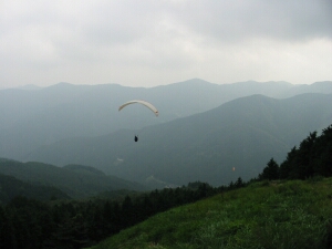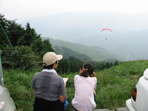 駐車場の横もパラグライダーの発進場となっており、ちょうど飛ぶ直前の人がいた。