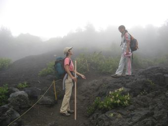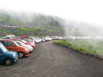 朝6時起床、6時40分出発。関越、圏央、中央と高速を乗り継ぎ、東富士五胡有料道路の須走ICで降りた。新五合目須走口の手前はジグザグのキツイ上り坂が続き、ローギアのアクセルべた踏みでも車がノロノロとしか進まないので止まってしまうかとひやひやした。9時35分、須走口の駐車場に到着。今回はコースが変化に富むこと、下山が一番楽であること、そして比較的すいていることを考えて須走口からの登山を決めたのだが、平日なのに車が一杯なので驚いた。