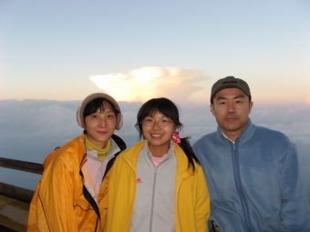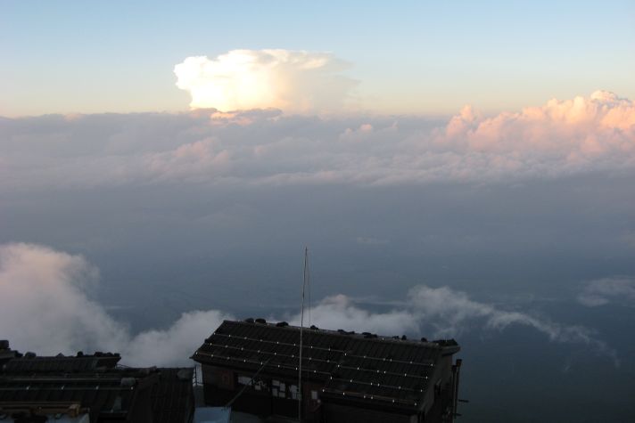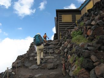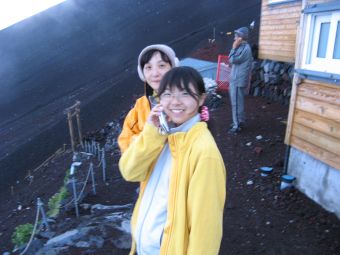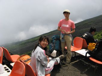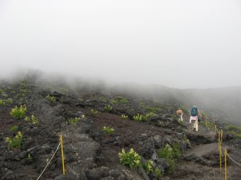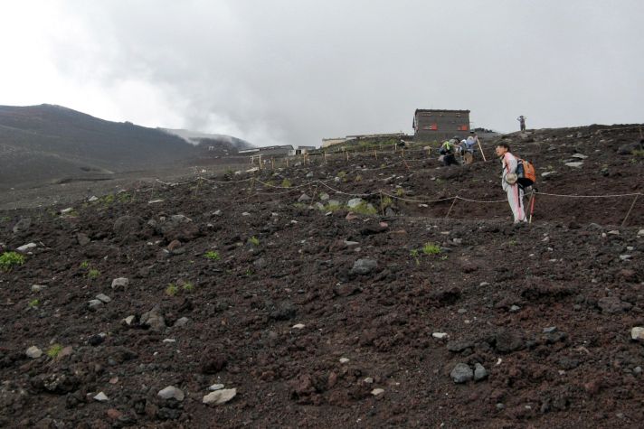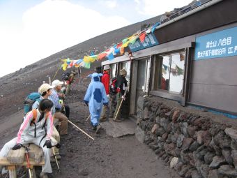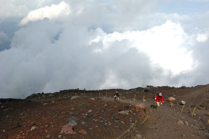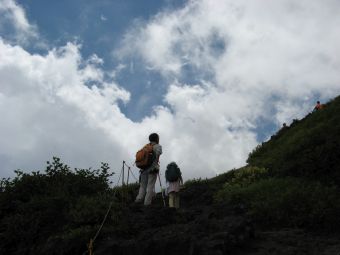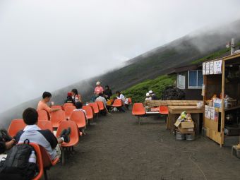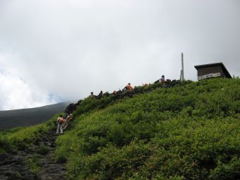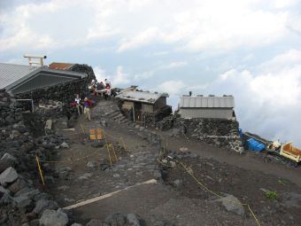 心配していた天気は、霧が出ていたくらいで何の問題もなく、雲や霧が強い日差しを遮ってくれたので、かえって快適に登ることができた。時間的にも体力的にも余裕をもって本八合目に到着したので、これは予想以上に楽に登れそうだと感じていたのだが、夜になって状況は一変した。寝床が埃っぽくて狭い上に頭痛がしてきて寝られなくなり、しまいに熱が出てきたのだ。これではとても登れないと考えているうちに、御来光を山頂でみる人たちが山小屋を出発し、その騒音と自分のふがいなさに腹が立ってきて、最後はどんな状態でも登ってやるとの思いに至った。嫁もあまり寝られなかったようだし、娘もお腹がすいたり鼻水が出たりと寝苦しかったようだ。