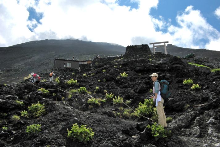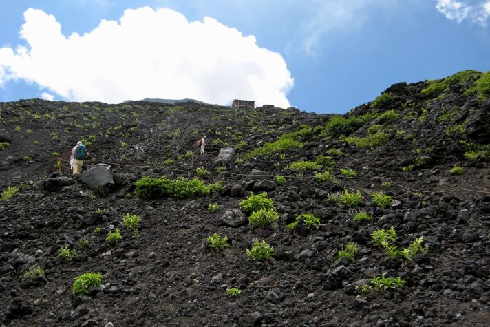 ゆるやかな砂礫の斜面を上り、1時間半で新六合目・長田山荘に到着。
