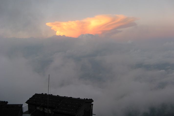 雲海から飛び出るように発達した積雲が橙色に染まっていく。