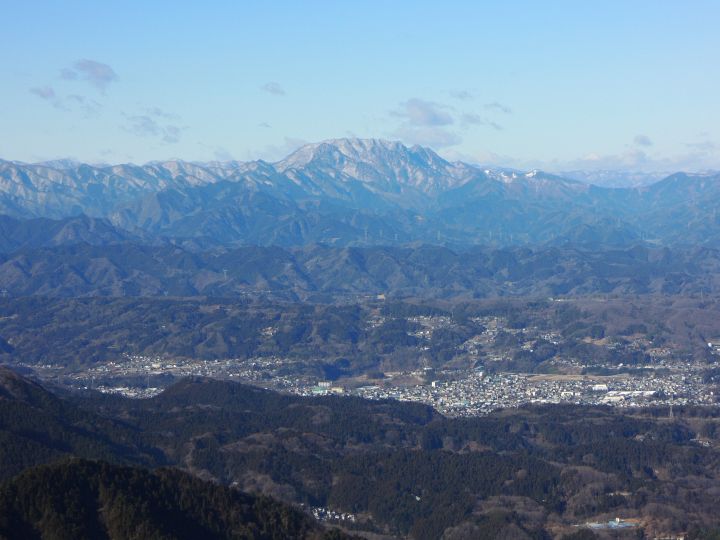 北西方面。左から赤久縄山、浅間山、御荷鉾山。秩父の街並もクリアに見えていた。
