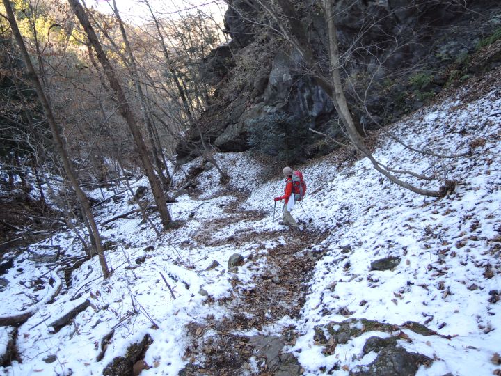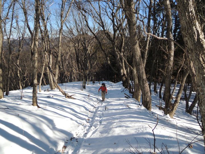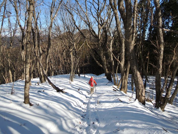 100mほど一気に下って、徐々に上りかえして行く。雪の吹き溜まりがかなり深くなっている所もあった。