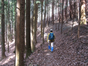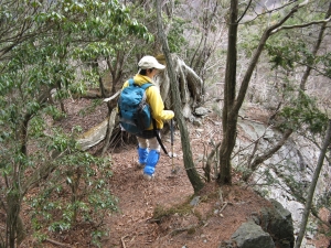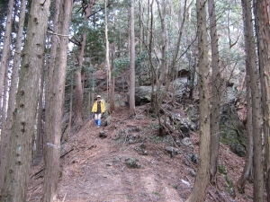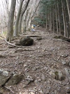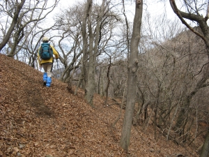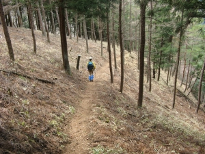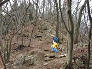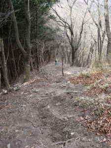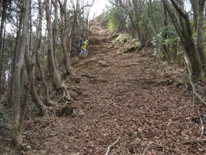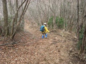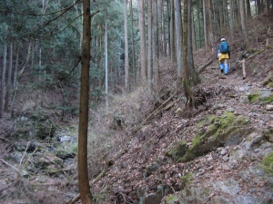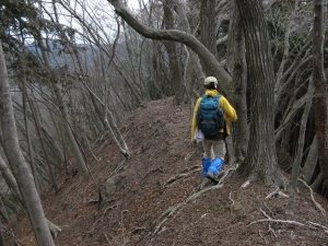 急坂が終わって尾根道に出ると歩きやすくなる。尾根から左に入ってどんどん下って行く。