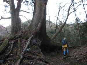 岩の上に根を下ろした巨樹の脇を通る。樹の横には小さな祠が祀られていた。
