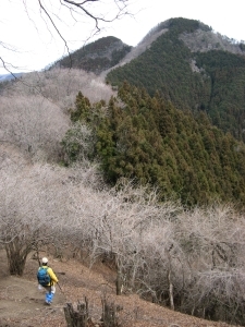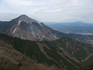 雄岳に戻ると登山道を示す標識があった。武甲山を前方に見ながら、長い急坂を降りてゆく。風が強かった。