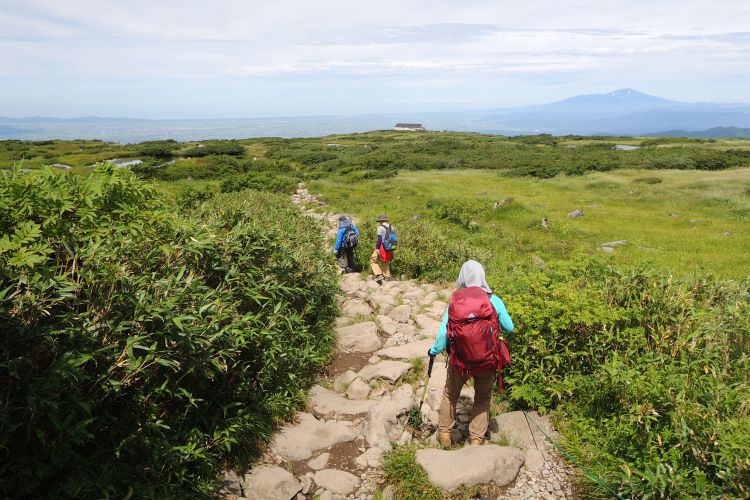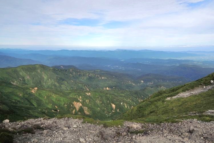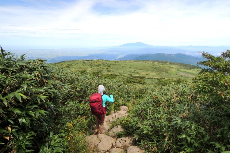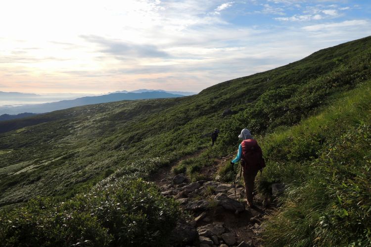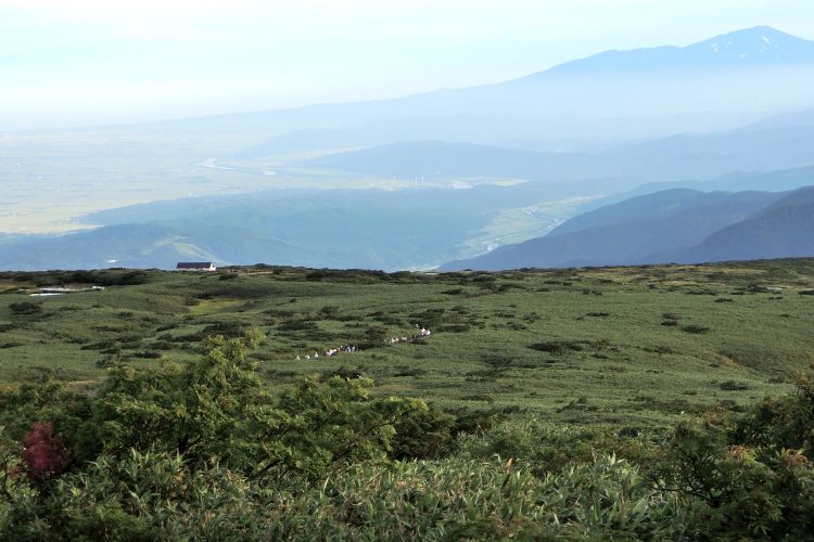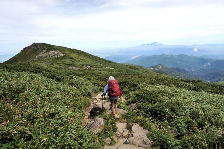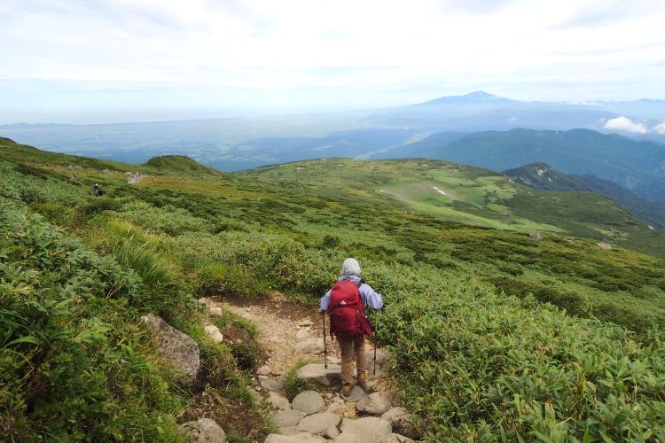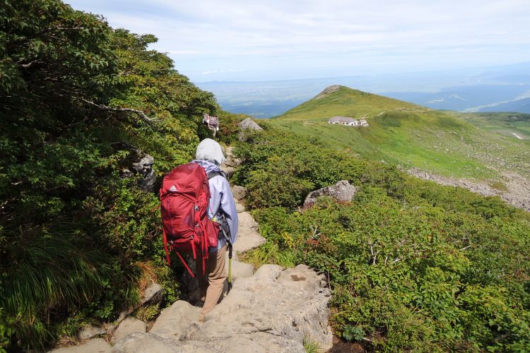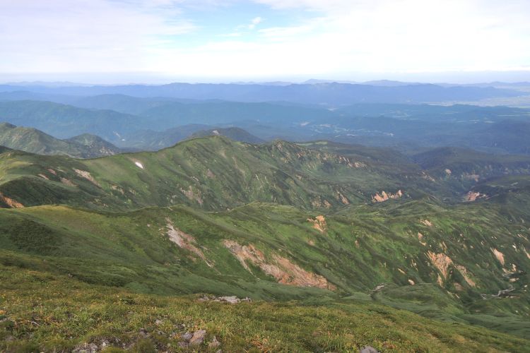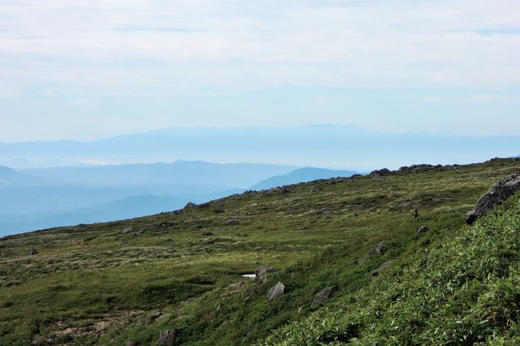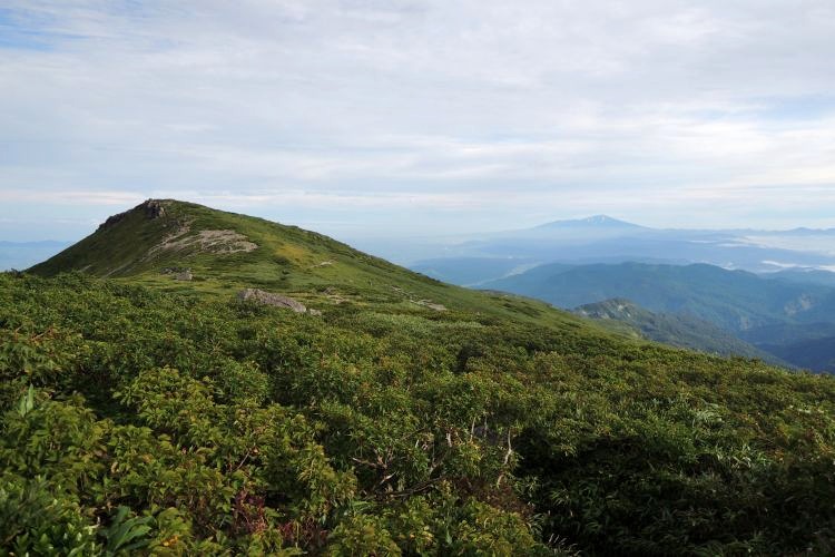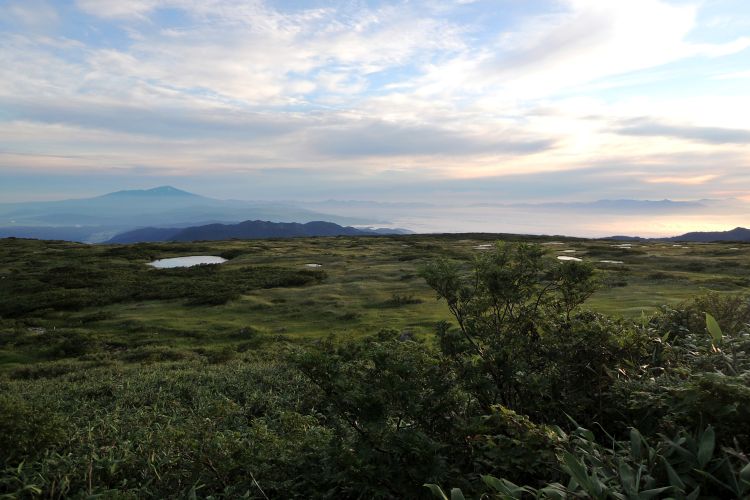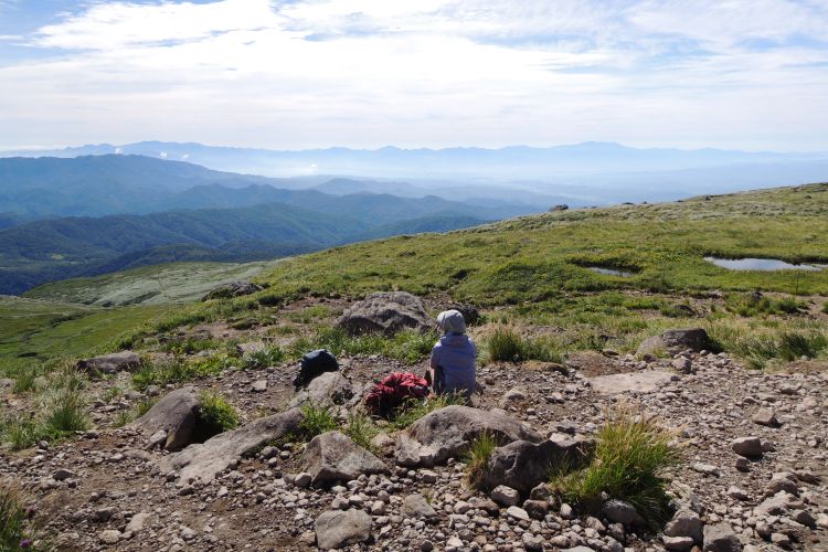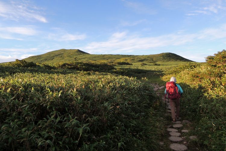 4時起床、5時5分登山開始。5時頃、大型バス2台が駐車場に入ってきて、一気に人が増えたので急いで出発した。前日の疲れが抜けきらずに朝から身体は重たかったが、登山道はよく整備されていて歩きやすかった。予報が二転三転して心配していた空模様は朝から快晴で、広々とした稜線や山頂から名だたる東北の名峰を一望することができた。残っていた高山植物が度々目を楽しませてくれたし、前日同様に虫がまったくいなかった。復路は多くの団体とすれ違ったが、登山道の幅が広いので待たされることはほとんどなかった。疲労の蓄積と寝不足で最後はへろへろだったが、のんびりとした山歩きを楽しめた。