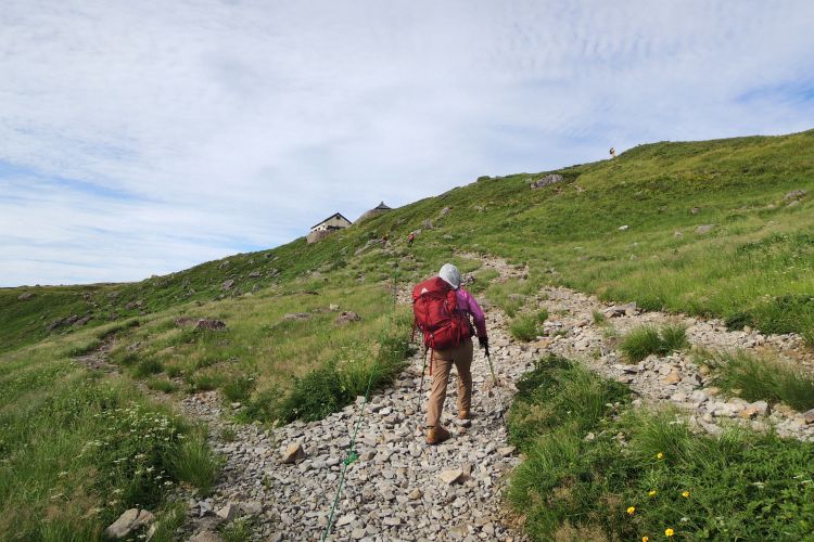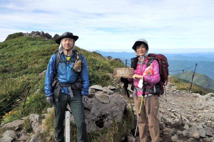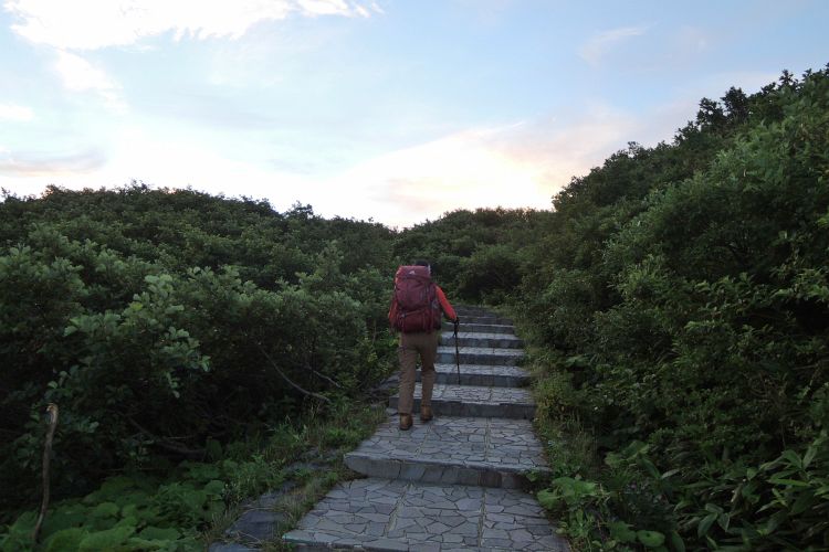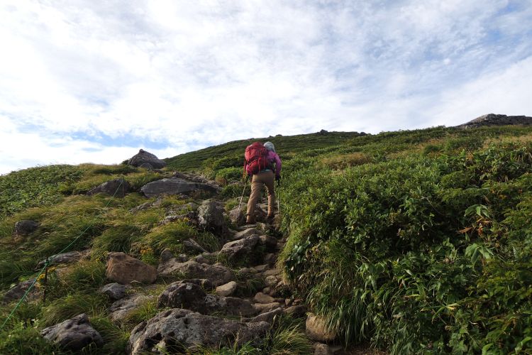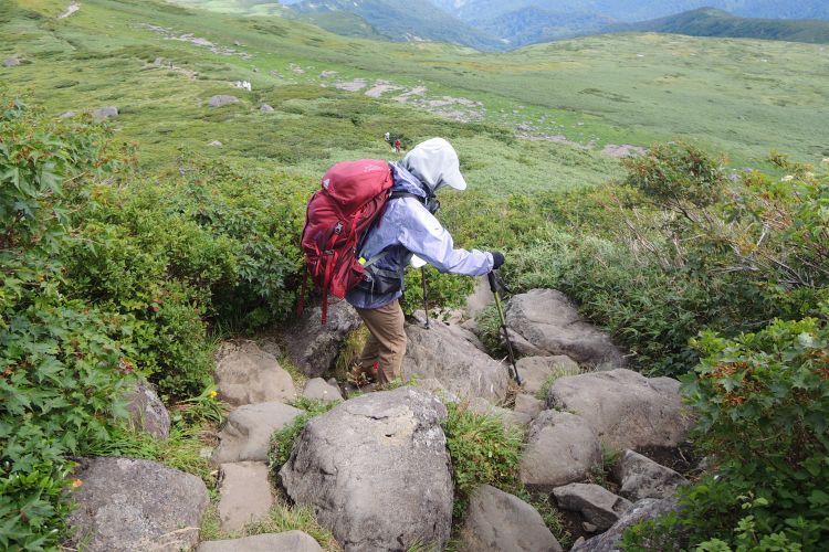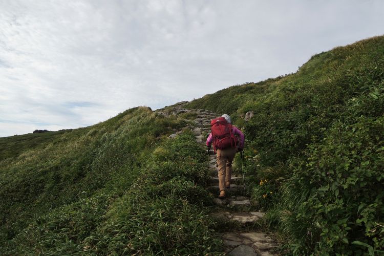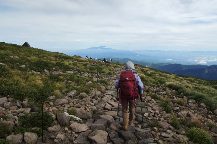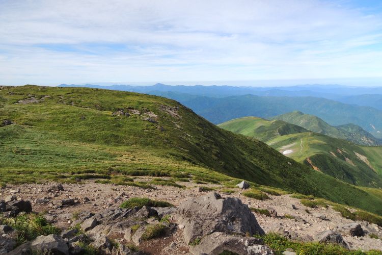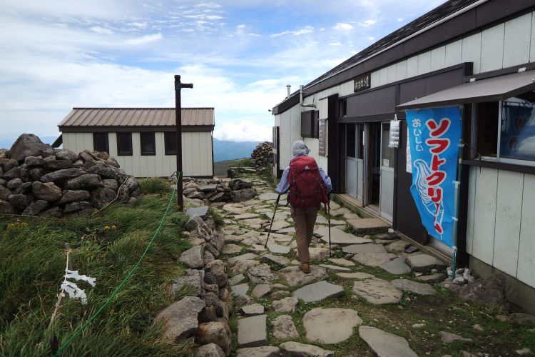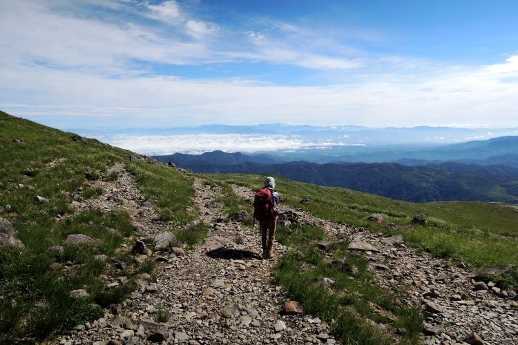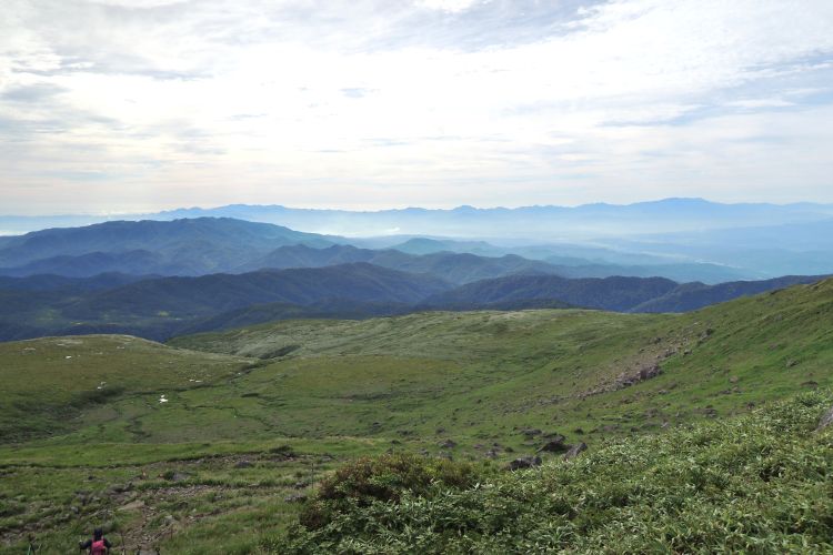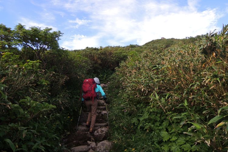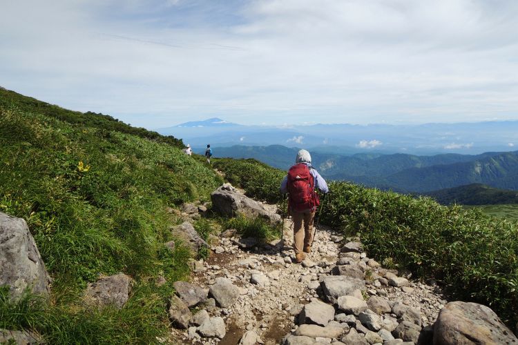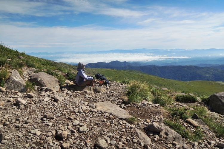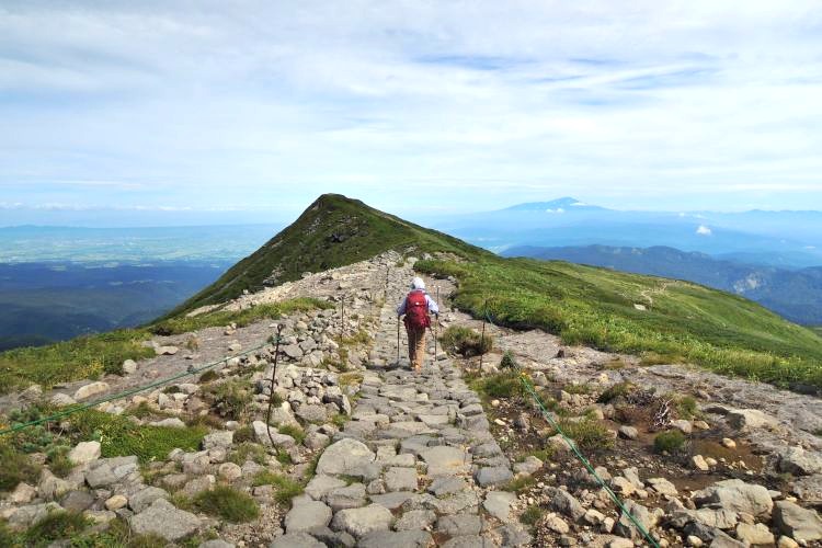 4時起床、5時5分登山開始。5時頃、大型バス2台が駐車場に入ってきて、一気に人が増えたので急いで出発した。前日の疲れが抜けきらずに朝から身体は重たかったが、登山道はよく整備されていて歩きやすかった。予報が二転三転して心配していた空模様は朝から快晴で、広々とした稜線や山頂から名だたる東北の名峰を一望することができた。残っていた高山植物が度々目を楽しませてくれたし、前日同様に虫がまったくいなかった。復路は多くの団体とすれ違ったが、登山道の幅が広いので待たされることはほとんどなかった。疲労の蓄積と寝不足で最後はへろへろだったが、のんびりとした山歩きを楽しめた。