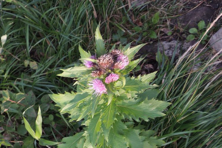 ウゴアザミ。花は上向きで葉の鋸歯は浅い。