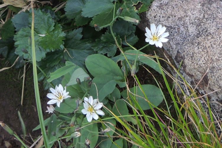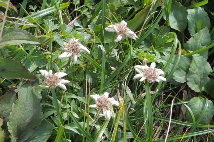 花期が早いキク科のミヤマウスユキソウ(別名ヒナウスユキソウ)もまだ残っていた。月山の他には秋田駒ヶ岳や鳥海山など、東北日本海側の高山に分布する。日本のウスユキソウは8種類ほどで、それぞれが住み分けるように分布しているので同定しやすい。